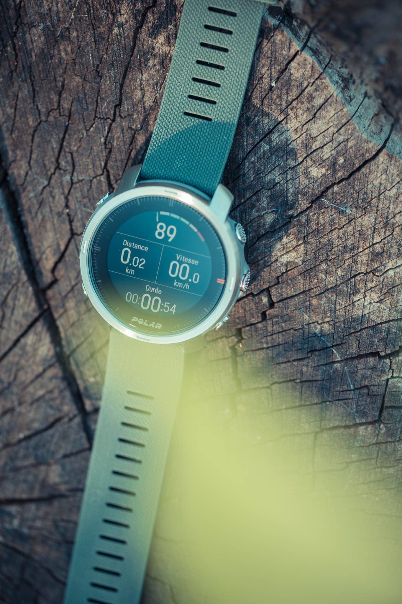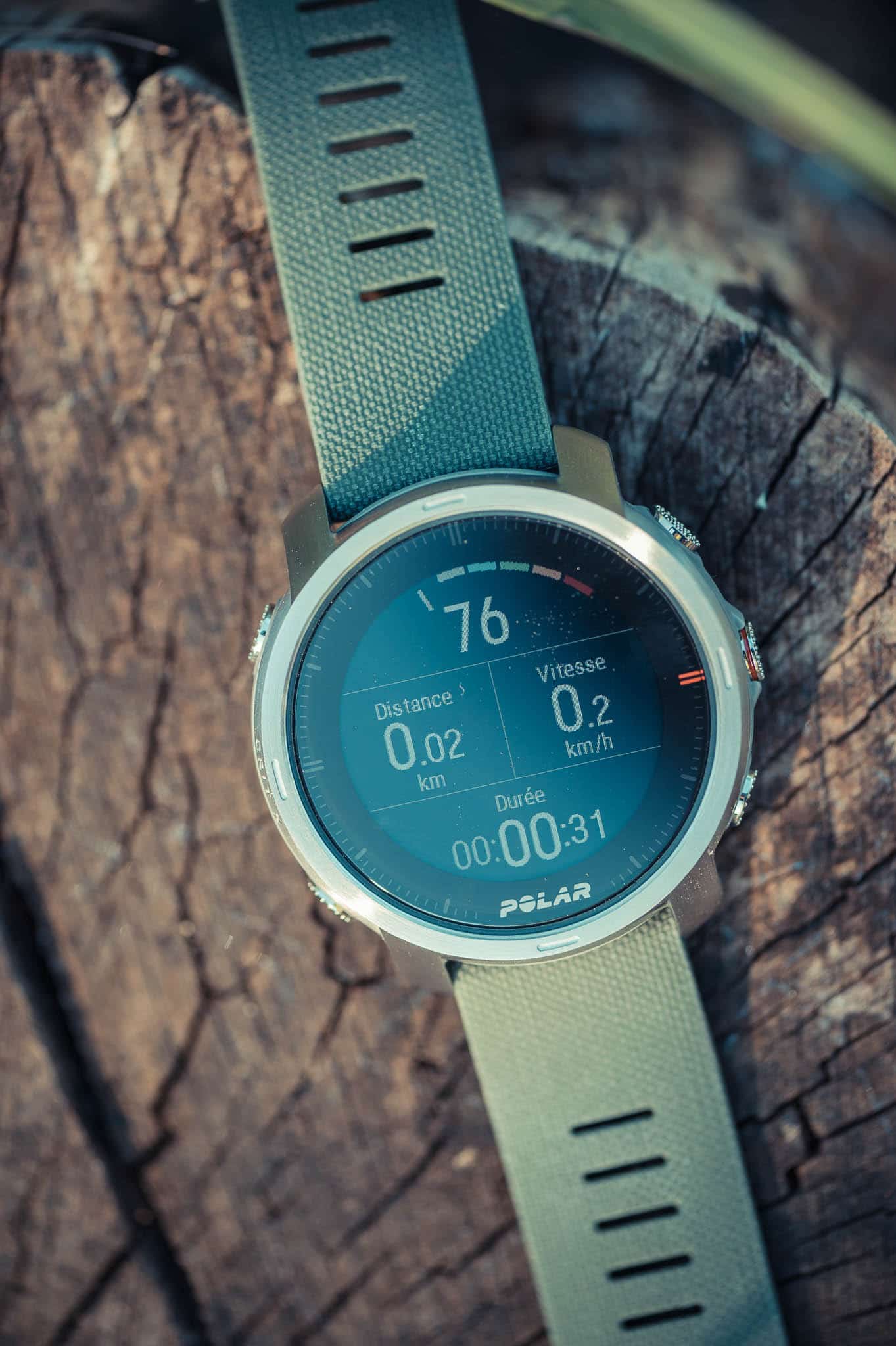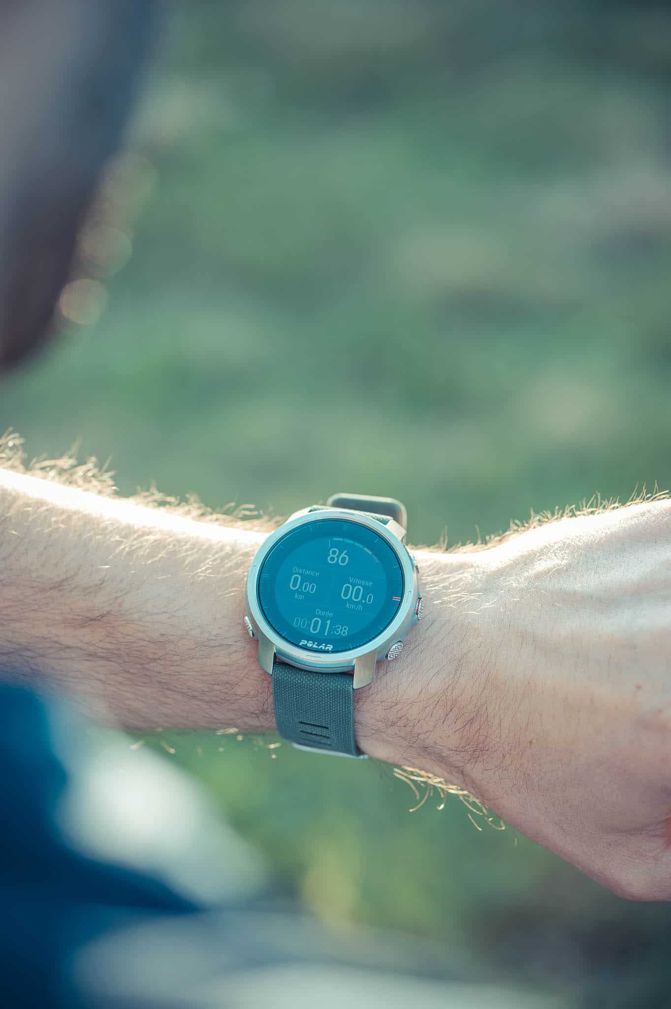 Niveau design, gros point positif pour le modèle vert/argent que Polar vient de m’envoyer. Elle n’est pas trop “sportive” au poignet et se portera au quotidien et on ne sent tout simplement pas ses 64g. Mettons-là à côté d’une Fenix 6 ou d’une Suunto 9 et elle n’a tout simplement pas la même construction. Cela ne veut pour autant pas dire que la montre n’est pas équipée pour résister aux rigueurs d’un trail ou d’une randonnée! On en parle plus loin.